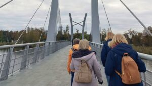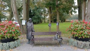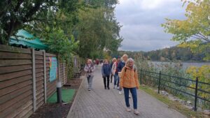 Dziękujemy pani Katarzynie Broniewskiej i udajemy się wspólnie do ławeczki naszej noblistki Wisławy Szymborskiej. Na ławeczce przysiadł kot, koło niego rozrzucone kartki z wierszem ”Kot w pustym mieszkaniu”, a Wisława stoi opierając się o ławkę. Robimy sobie wspólne zdjęcie i dalej Promenadą imienia Wisławy Szymborskiej, długości 1,8 km i 1,5 m. szerokości udajemy się do tawerny „Pod żaglami” na pyszny obiad.