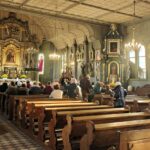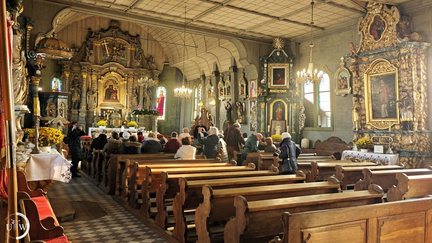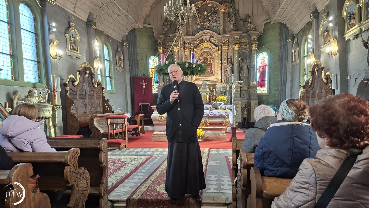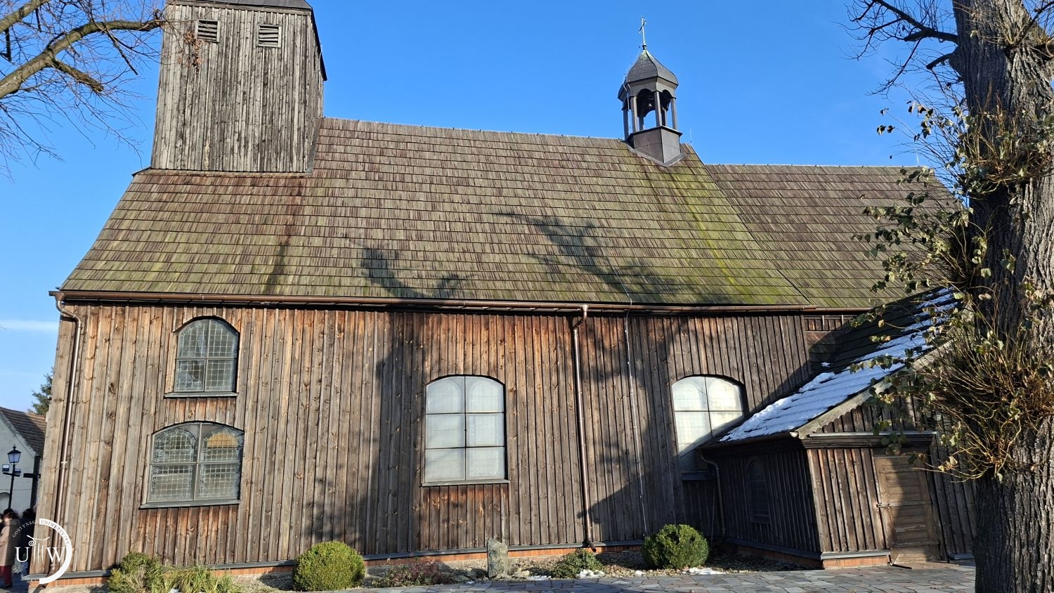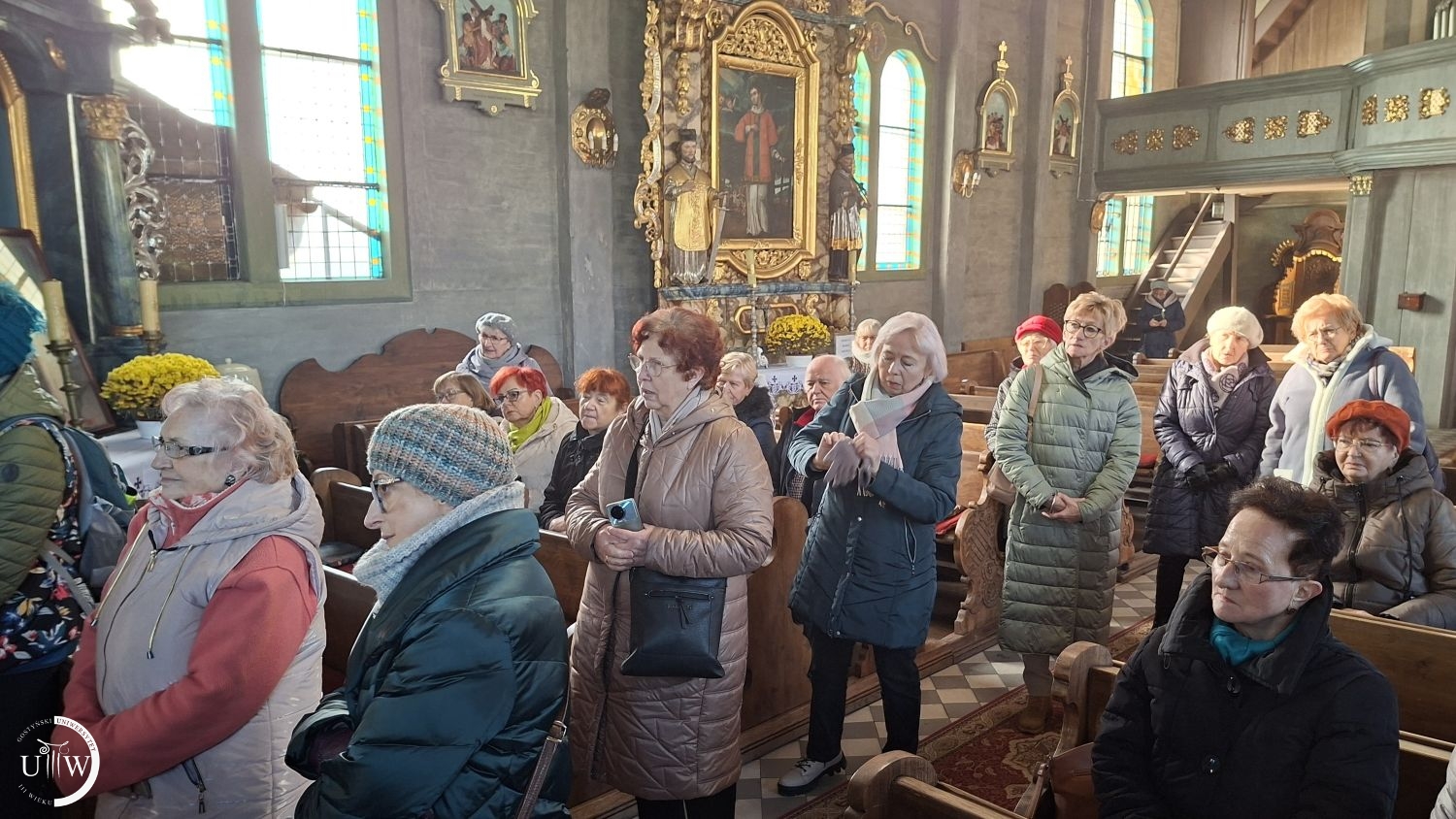 Po przejechaniu 25 km wysiadamy przed drewnianym kościołem parafialnym pw. Wniebowzięcia Najświętszej Maryi Panny w Żegocinie. Jest to absolutne novum dla uczestników, bo jeszcze nikt w tej miejscowości nie był a większość nawet nie słyszała o nazwie tej miejscowości. Do kościoła zaprasza nas ks. Marek Kozica proboszcz liczącej 1450 osób wspólnoty, opowiada o swoich parafianach i skomplikowanej przeszłości mieszkańców, bowiem były to tereny przygraniczne. Kiedy proboszcz mówi jakie siedem wiosek wchodzi w skład parafii wymienia miejscowość Grab. W tym momencie obecny z nami Tomek Barton uświadomił sobie, że tutaj sięgają jego korzenie rodzinne. Kościół ten uchodzi od wieków za miejsce kultu Maryjnego. W głównym ołtarzu znajduje się obraz Matki Bożej, który jest kopią rzymskiego obrazu Salus Populi Romani znajdujący się w kościele Santa Maria Maggiore. Pierwsze datowanie na podstawie akt wizytacyjnych pochodzi z 1639 roku. Koronacja odbyła się w 1780 roku, ale papieskie korony nałożono dopiero w 1965 roku. Aktu tego dokonał kardynał Stefan Wyszyński. Jedno z vot, naszyjnik ofiarowała Helena Modrzejewska. Obraz otaczany czcią, uznawany jako cudowny nazywany jest mianem Żegocińskiej Matki Różańcowej. Z okazji 60 rocznicy (1965-2025) koronacji powstał muzyczny album, wydany przez Stowarzyszenie Miłośników Wsi Żegocin i Ośrodek Kultury w Żegocinie z zapisem śpiewanego od niepamiętnych czasów różańca. Treść zachowała się wyłącznie w przekazach ustnych, stanowi historyczną wartość stanowiącym dziedzictwo kulturowe.