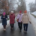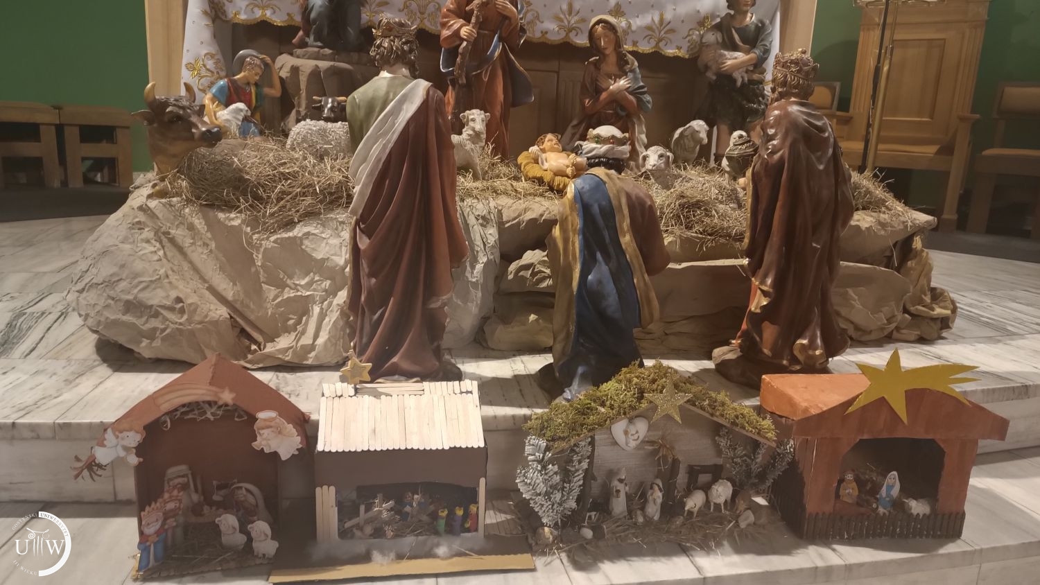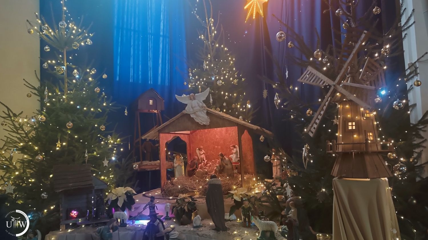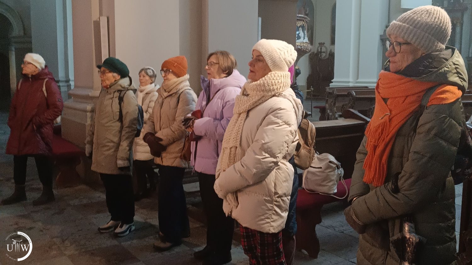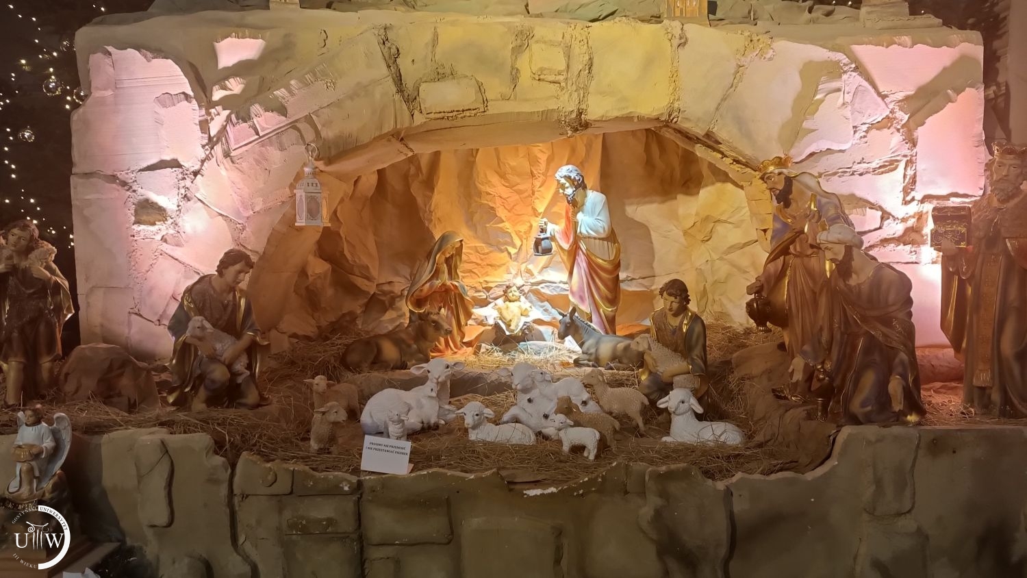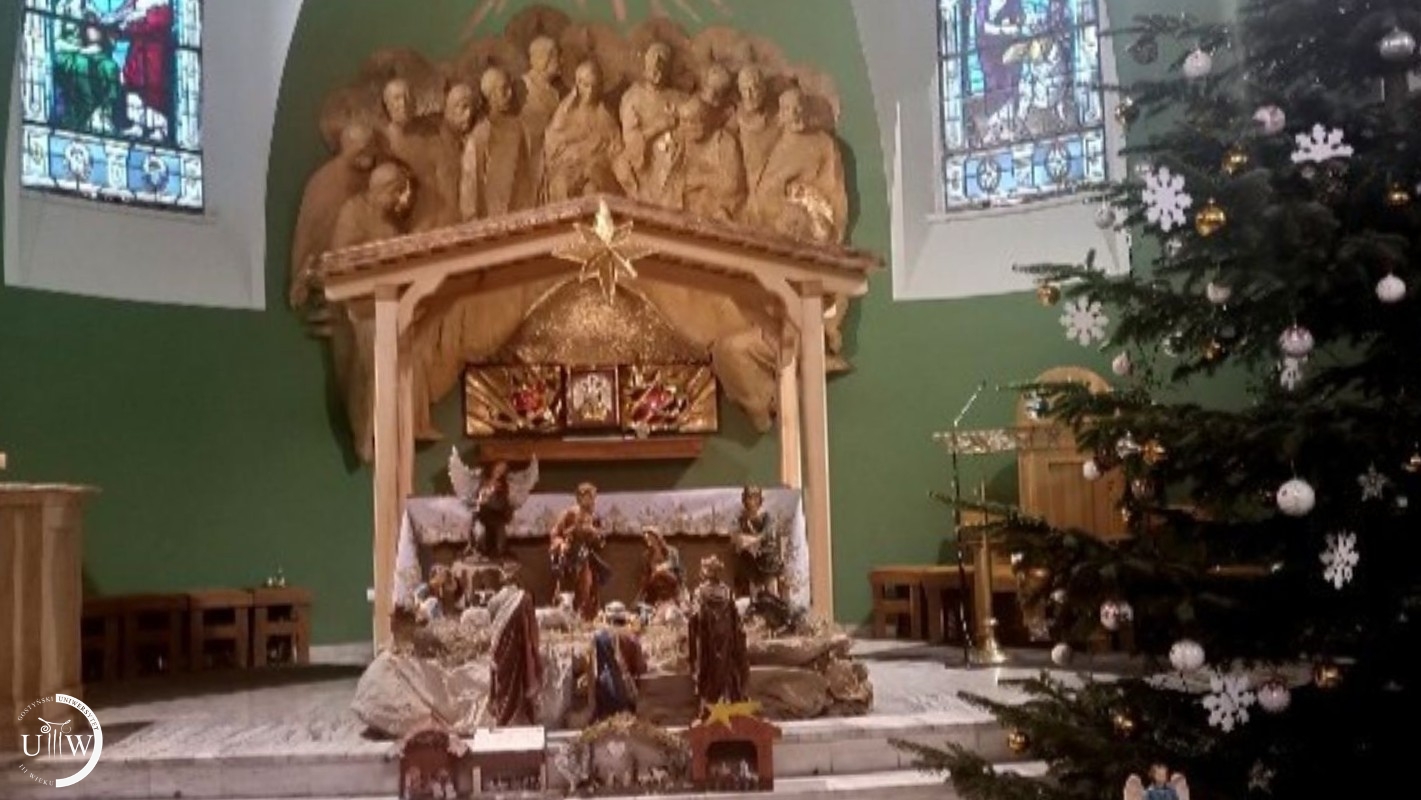 Dalej u końca ulicy Ogrodowej podziwiamy szopkę na wolnym powietrzu. Jest piękna, chociaż jej prawdziwy urok można zobaczyć dopiero po zapadnięciu zmroku. Kościół Farny wita nas ruchomą szopką. Pieniążek ożywia szopkę i płynie kolęda. Czwarty żłobek na Świętej Górze zwieńcza napis „Idźcie i głoście”. Słowo przewodnie co roku jest inne. I jeszcze jeden mały żłobek w holu Kongregacji na przeciw wejścia do budynku. A potem na tle choinki robimy sobie wspólne zdjęcie. Przy każdym ze żłobków, tych w kościele, odśpiewujemy jedną z kolęd. A potem idziemy do stołówki Verni na cieplutką kawę. Tam omawiamy jeszcze sprawy naszego Uniwersytetu, wydarzenia kulturalne, ostatnio obejrzane filmy czy przeczytane książki. Następne spotkanie za dwa tygodnie. Przeszłyśmy 8 kilometrów.